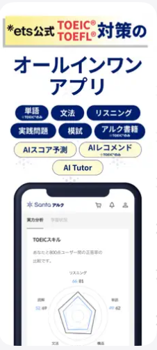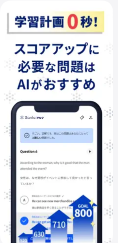 Santaアルクは、株式会社アルクが運営するTOEIC L&R(リスニング&リーディング)専用の学習アプリだよ。